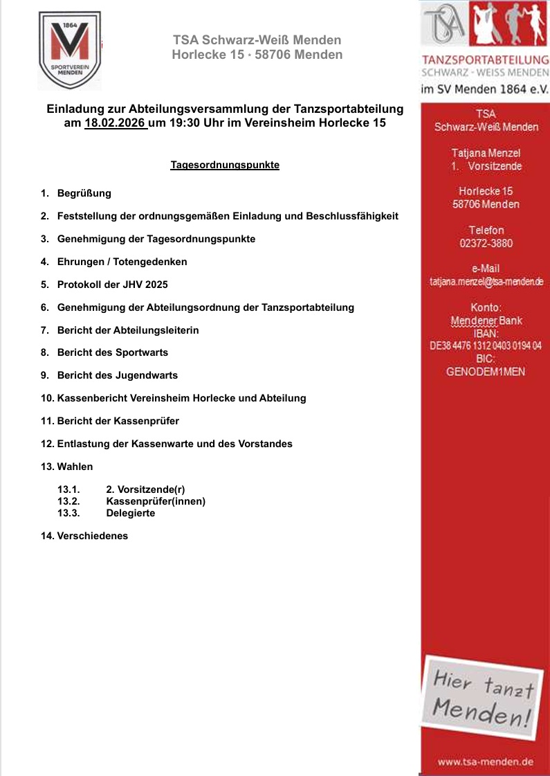 Endlich - nach 2 Jahren pandemiebedingter Pause, zeigt die Tanzsportabteilung des SV Menden am Sonntag, den 05. Februar um 14:30 Uhr in ihrem Vereinsheim in der Horlecke 15, wie facetten- und abwechslungsreich moderner Tanzsport ist. Klassische und lateinamerikanische Tänze mit Partner führt die Breitensportgruppe vor: Cha Cha, Jive, Walzer, Tango und Disco Fox zeigt die Breitensportgruppe, die bereits an verschiedenen Tanzturnieren teilgenommen hat.