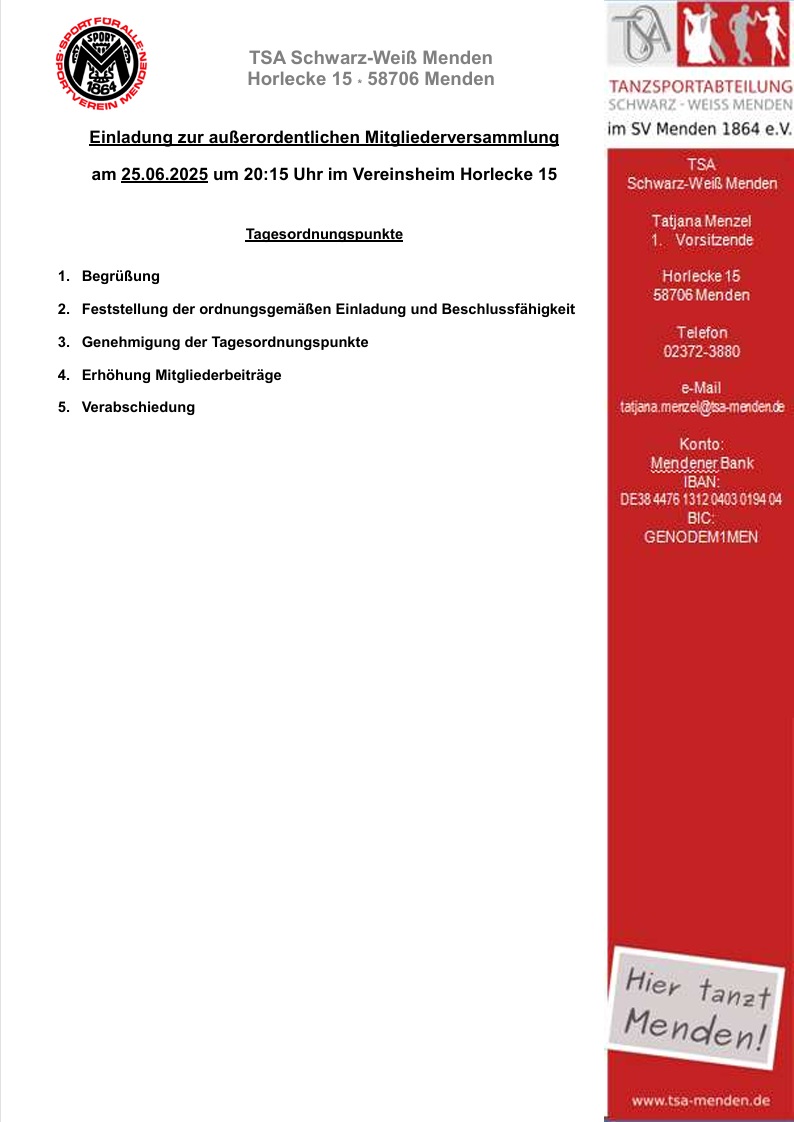 Endlich - nach 2 Jahren pandemiebedingter Pause, zeigt die Tanzsportabteilung des SV Menden am Sonntag, den 05. Februar um 14:30 Uhr in ihrem Vereinsheim in der Horlecke 15, wie facetten- und abwechslungsreich moderner Tanzsport ist. Klassische und lateinamerikanische Tänze mit Partner führt die Breitensportgruppe vor: Cha Cha, Jive, Walzer, Tango und Disco Fox zeigt die Breitensportgruppe, die bereits an verschiedenen Tanzturnieren teilgenommen hat.